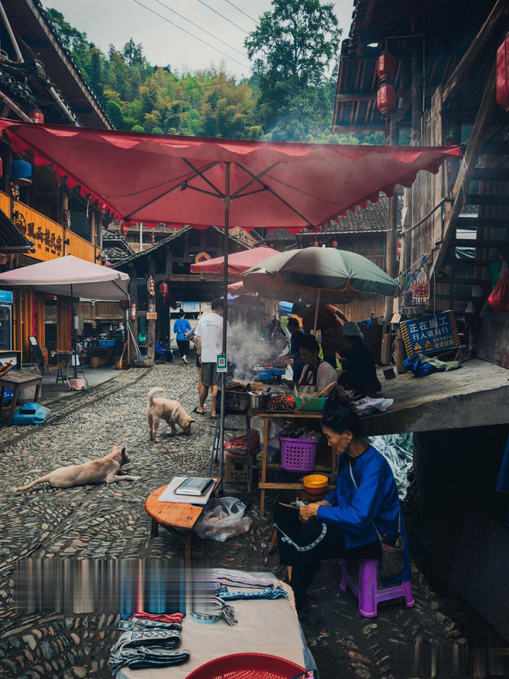 天刚亮,捶布声从溪边传来,老人坐在花桥上聊天,手里编着彩带,小孩光脚跑过青石板,笑声回荡在木楼间。烟火气混着木香弥漫整条街。没有表演,没有游客,像误闯进一个未被惊扰的时光角落。