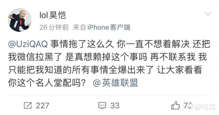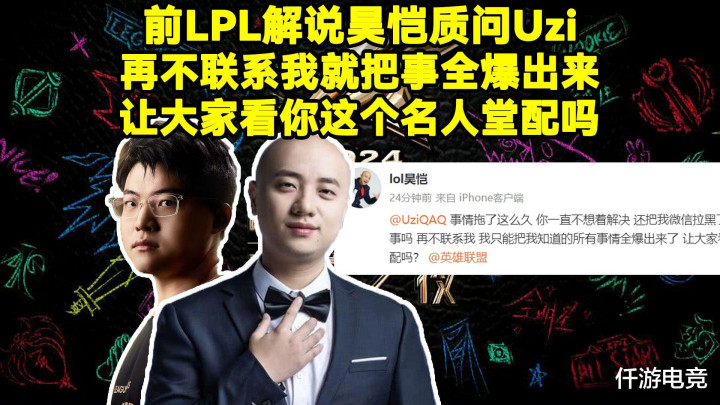 前LPL解说昊凯在个人账号上发文针对UZI,说某件事情拖延了很多的时间,如果UZI还不想着解决,甚至还透露说UZI把他的聊天方式给拉黑了。那么昊凯他只能通过自爆的方式,来拖UZI同归于尽,让大家看看UZI配不配得上这个LOL名人堂。