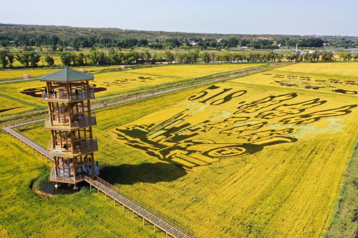 如今的黄河稻渔生态观光园规划占地面积约3000亩,其中稻渔立体种养1800余亩,年产稻米100多万斤。登上观景塔俯瞰,“哪吒”等巨幅稻田画作在大地上铺展开来,配合700米长的玻璃栈道、树屋民宿、VR体验馆等设施,吸引了大批游客前来打卡。