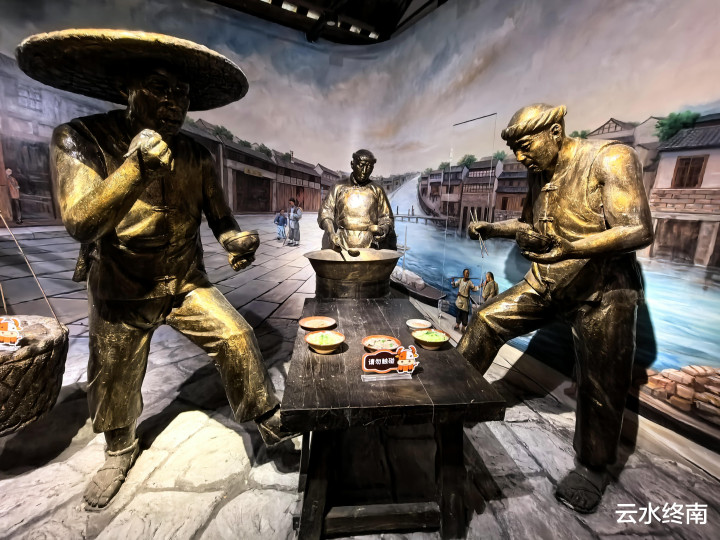 好容易停车过了廊桥,眼前商铺林立,各种异香扑鼻,这就是苏稽最有名的美食街。