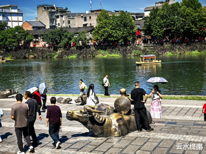 沿着水边还有铜牛雕塑,另外就是茶摊摊了。
