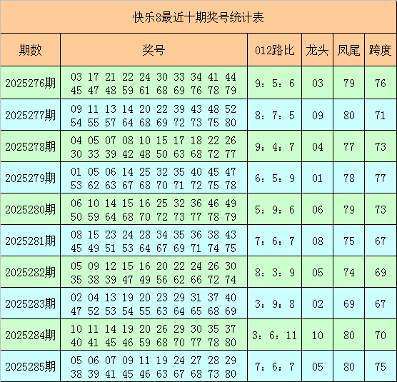 快乐8第2025285期奖号为:05 06 07 09 11 19 24 27 28 29 38 39 41 45 46 63 67 68 73 80,其中奖号012路比为7:6:7,0路号码(7个):06、09、24、27、39、45、63,1路号码(6个):07、19、28、46、67、73,2路号码(7个):05、11、29、38、41、68、80。