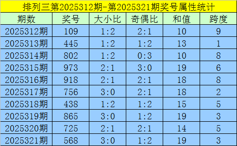 上期回顾:排列三第2025321期出现奖号568。开出组六,奇偶比1:2,012路比1:0:2,大小比3:0,和值19,跨度3。